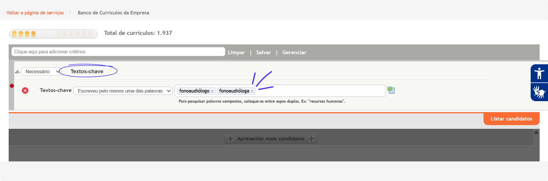Entenda como funcionam os critérios de triagem por palavras nas buscas ativas realizadas em vagas ou nos bancos de currículos. Esses critérios ajudam você a encontrar pessoas com características mais alinhadas ao que está buscando.