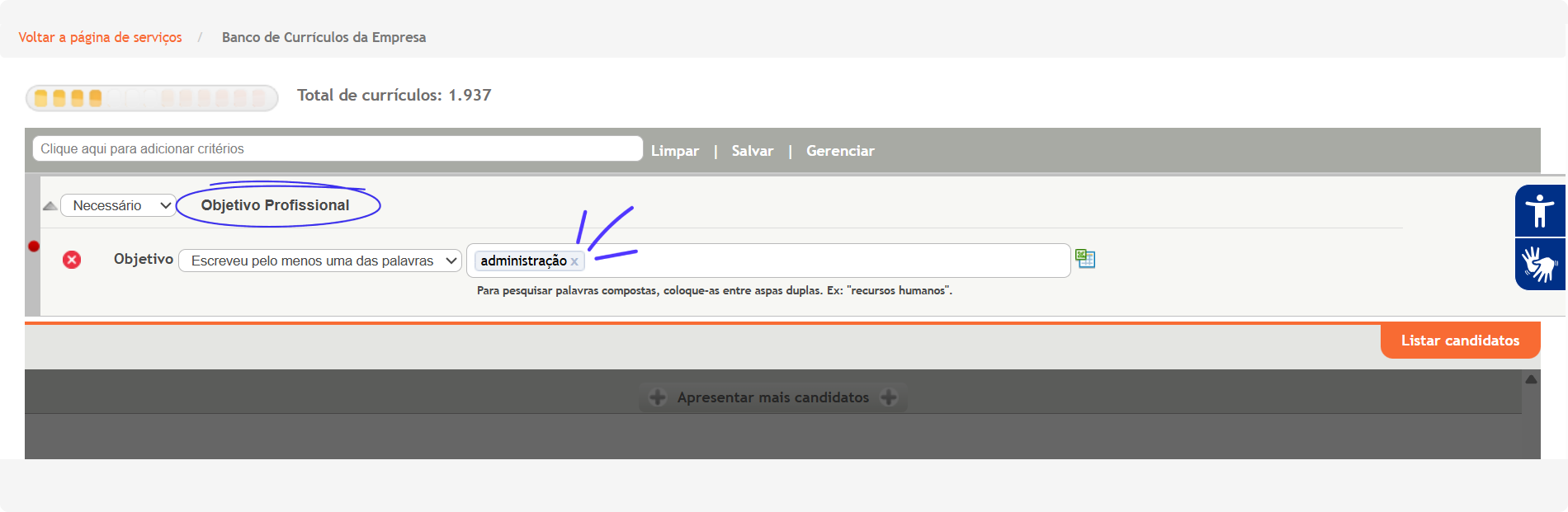Como os campos preenchidos pelos candidatos são livres, cada um pode escrever o mesmo termo de maneiras diferentes, por exemplo, "Excel" e "Pacote Office". Por isso, variar suas buscas ajuda a garantir uma triagem mais completa e eficaz.